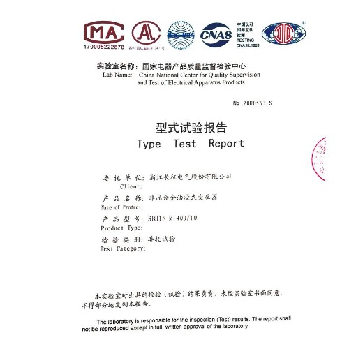 SBH15-M-400/10非晶合金油浸式變壓器 型式試驗報告