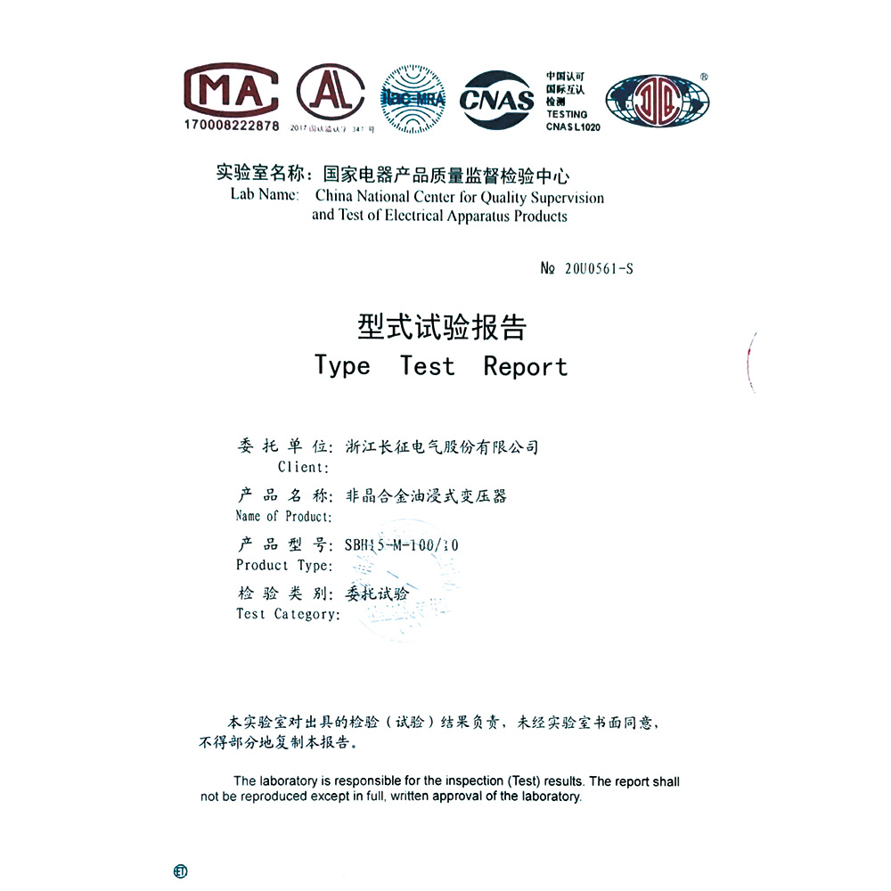 SBH15-M-100/10非晶合金油浸式變壓器 型式試驗報告