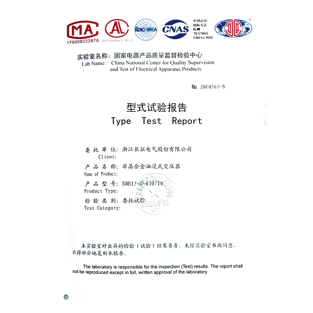 SBH15-M-630-10非晶合金油浸式變壓器 型式試驗報告
