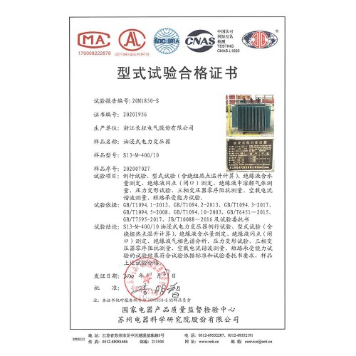 S13-M-400/10油浸式電力變壓器 型式試驗(yàn)合格證書