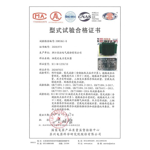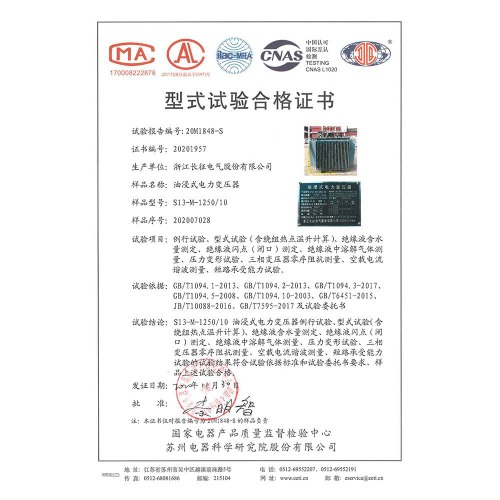 S11-M-1250/10油浸式電力變壓器 型式試驗(yàn)合格證書