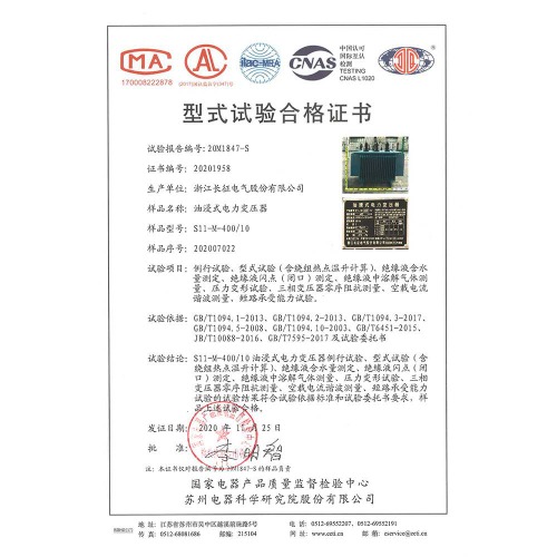 S11-M-400/10油浸式電力變壓器 型式試驗(yàn)合格證書