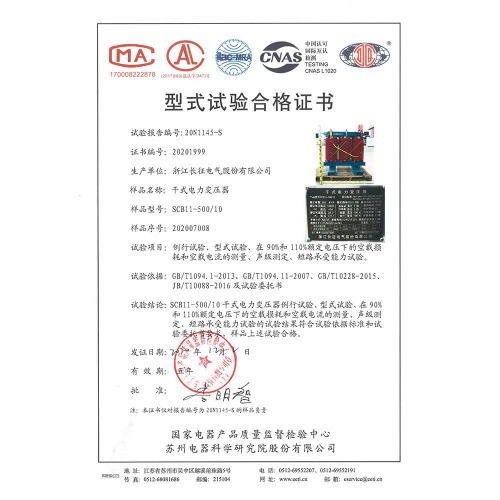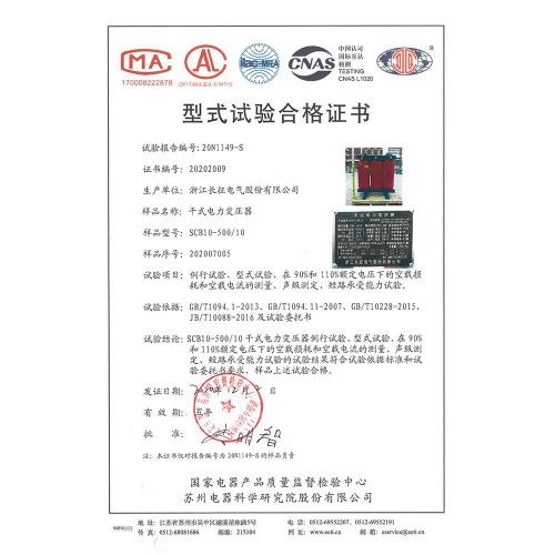 SCB10-500/10干式電力變壓器 型式試驗(yàn)合格證書