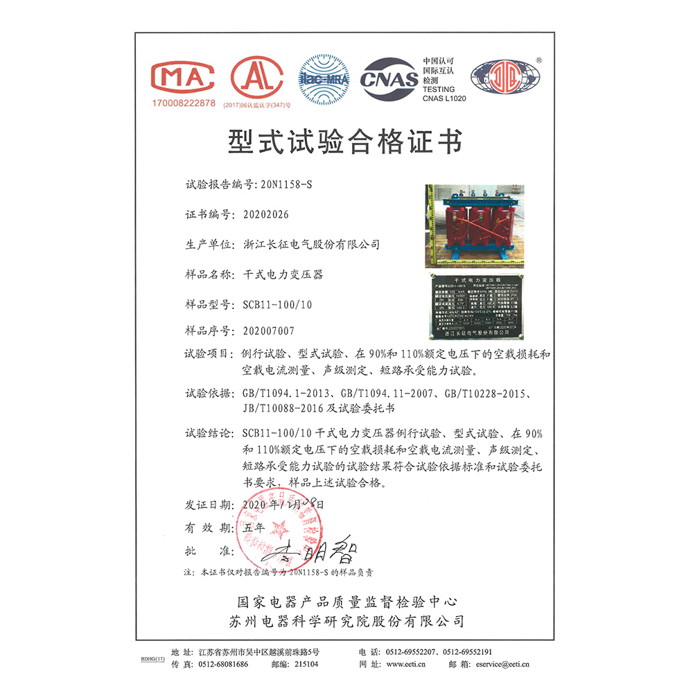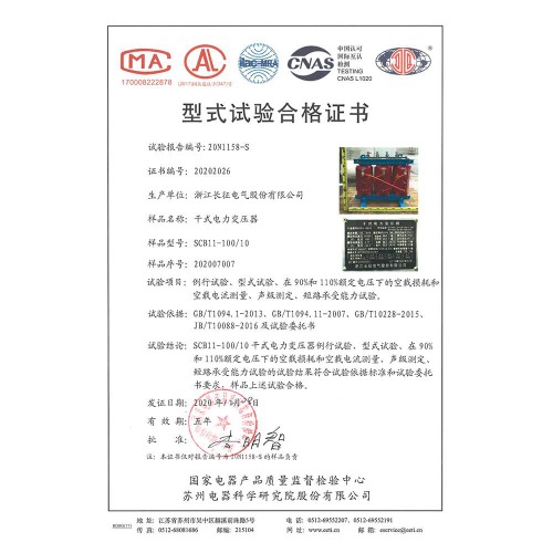 SCB11-100/10干式電力變壓器 型式試驗(yàn)合格證書