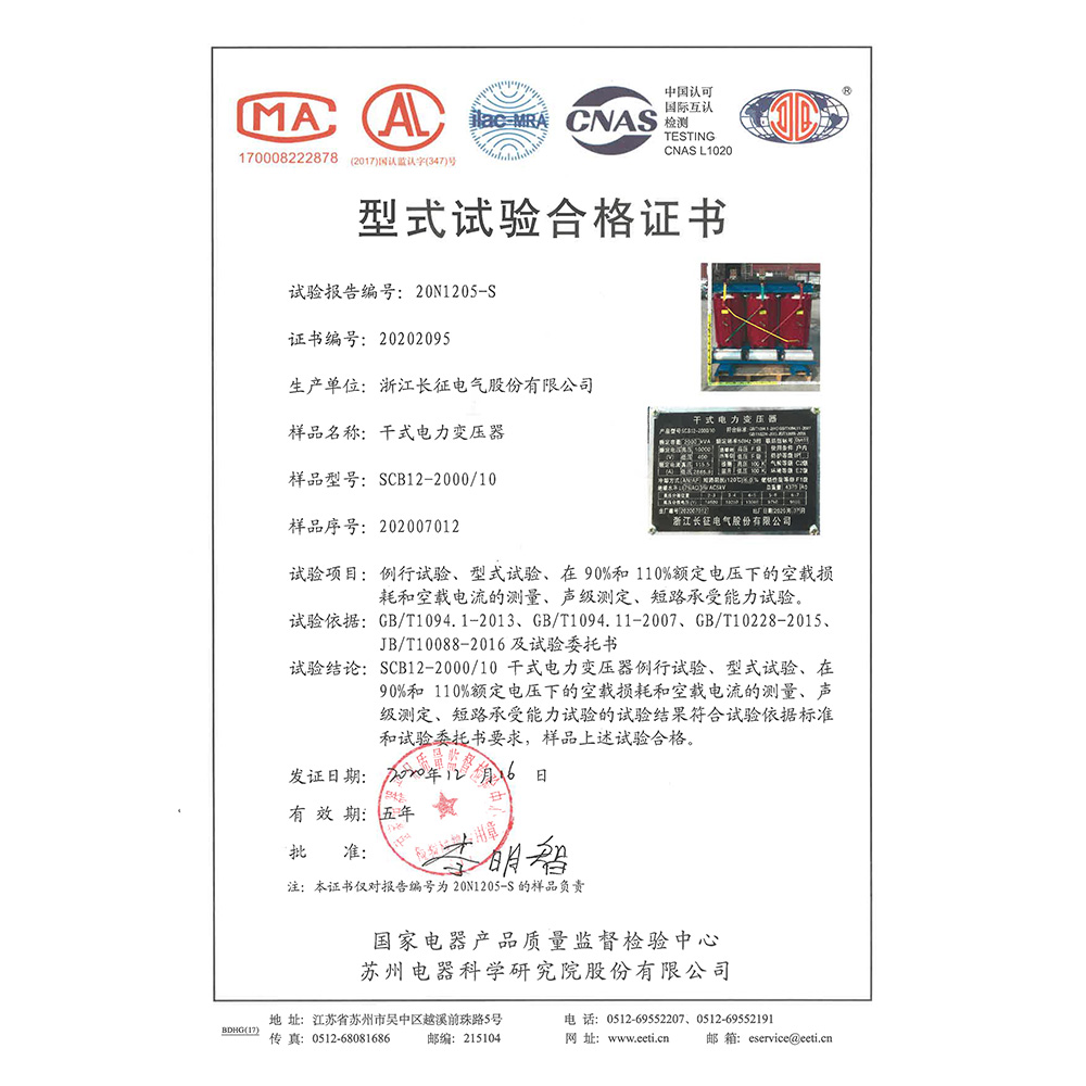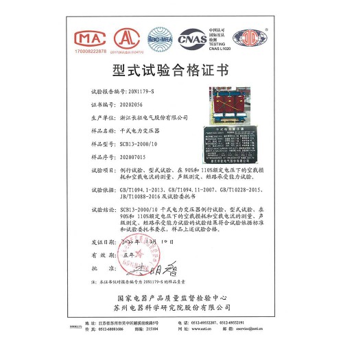 SCB12-2000/10干式電力變壓器 型式試驗(yàn)合格證書