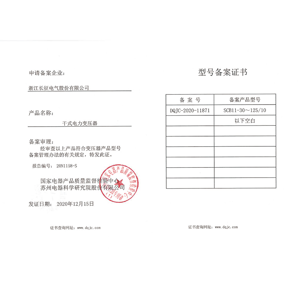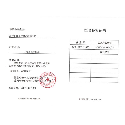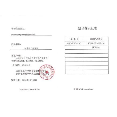 SCB11-30~125/10干式電力變壓器 型號備案證書