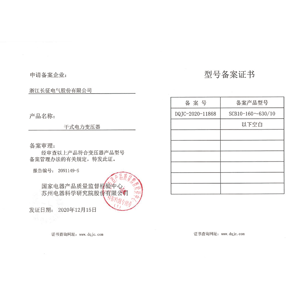 SCB11-160~630/10干式電力變壓器 型號備案證書