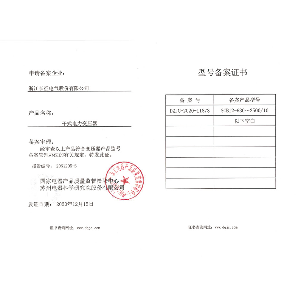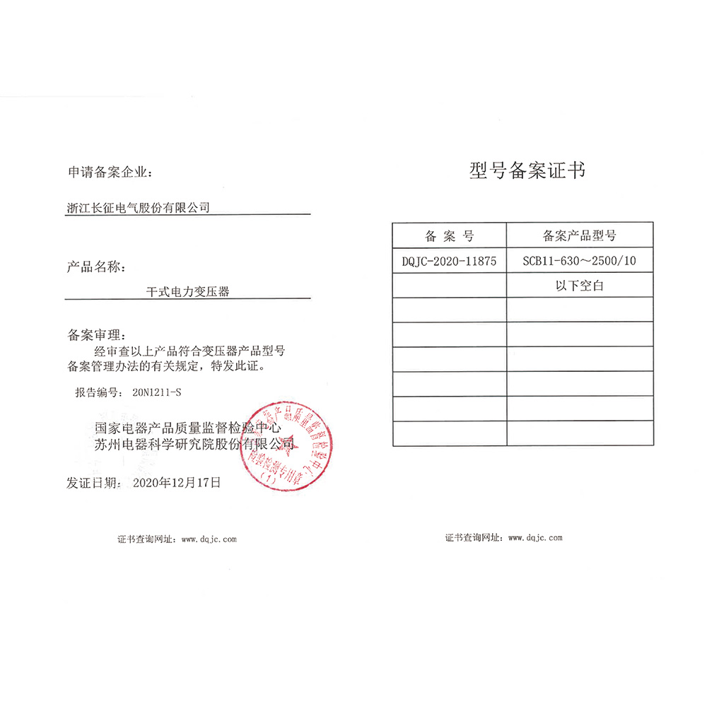 SCB11-630~2500/10干式電力變壓器 型號備案證書