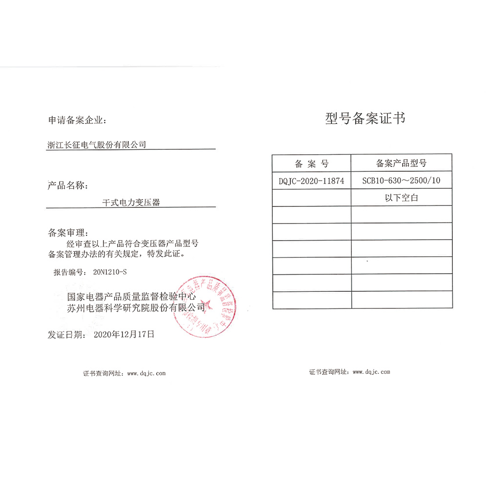 SCB10-630~2500/10干式電力變壓器 型號備案證書