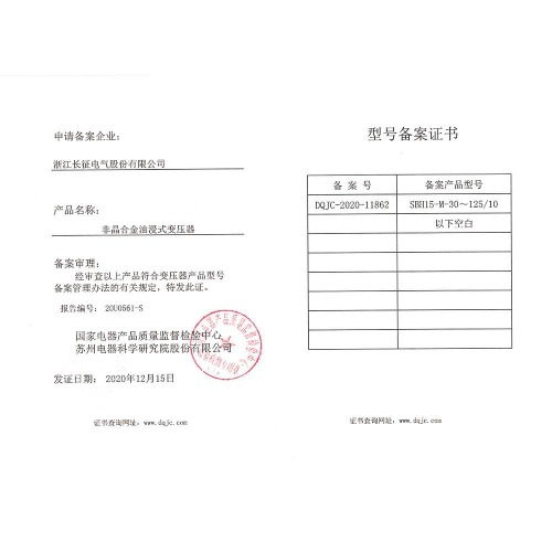 SBH15-M-30~125/10非晶合金油浸式變壓器 型號(hào)備案證書