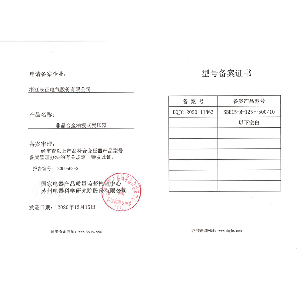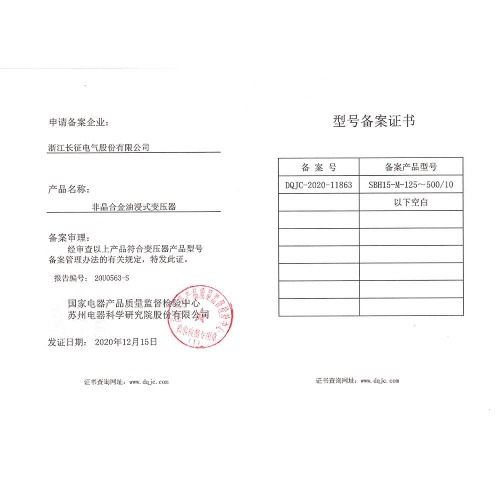 SBH15-M-125~500/10非晶合金油浸式變壓器 型號(hào)備案證書