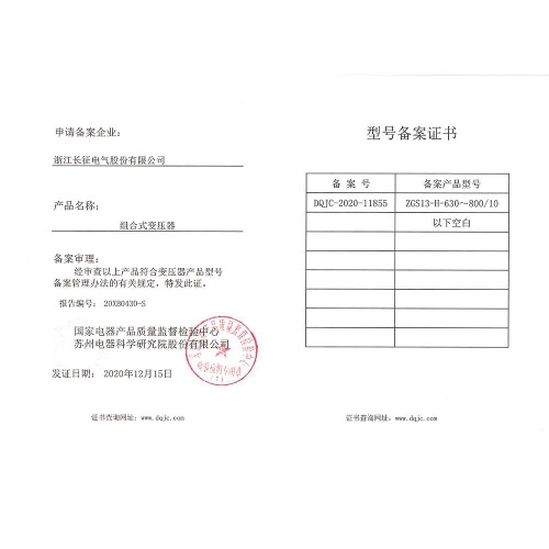 ZGS13-H-630~800/10組合式變壓器 型號(hào)備案證書