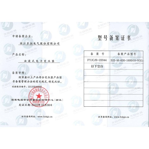 S22-M-630-1600/10-NX1油浸式電力變壓器 型號(hào)備案證書
