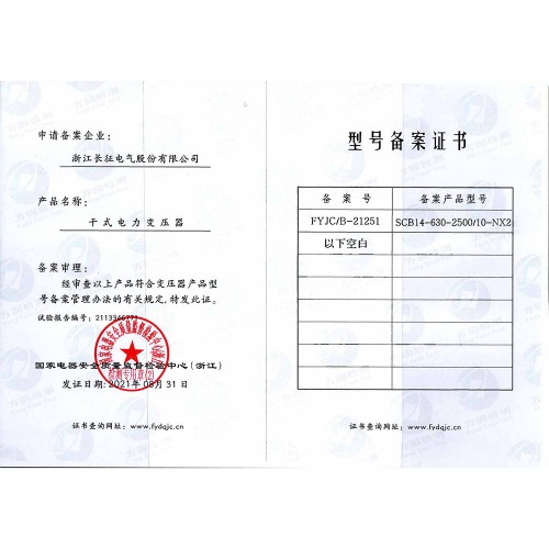 SCB14-630-2500/10-NX2干式電力變壓器 型號(hào)備案證書