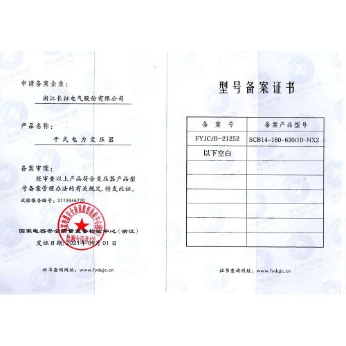 SCB14-160-630/10-NX2干式電力變壓器 型號(hào)備案證書