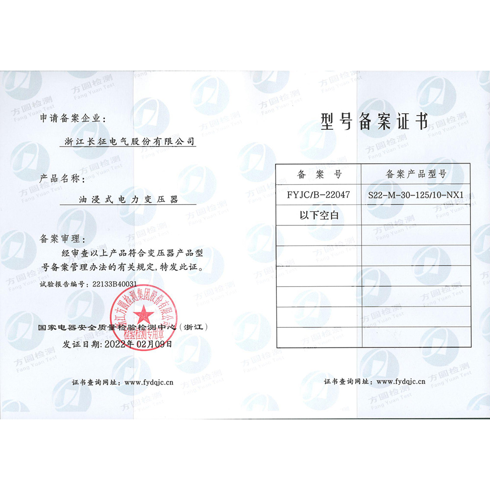 S22-M-30-125/10-NX1油浸式電力變壓器 型號(hào)備案證書