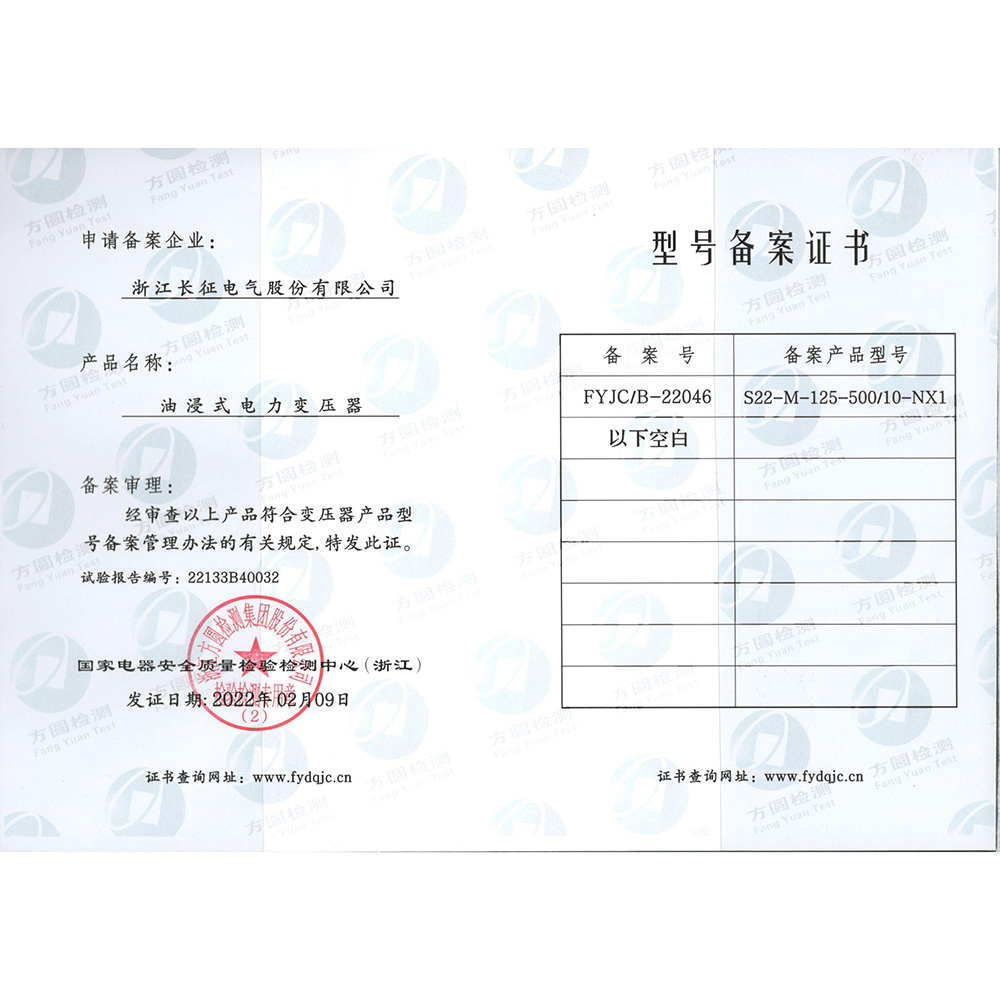 S22-M-125-500/10-NX1油浸式電力變壓器 型號(hào)備案證書
