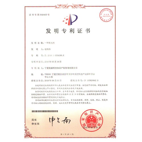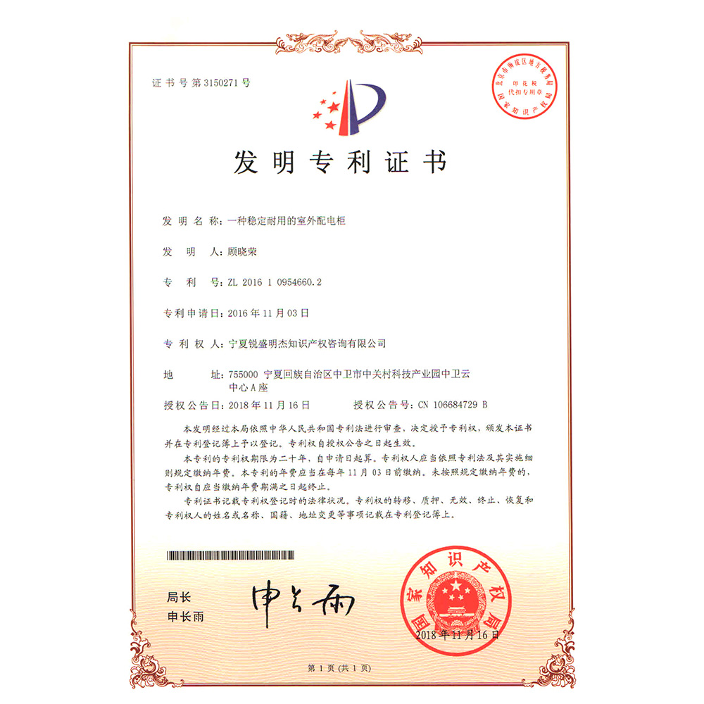 一種穩定耐用的室外配電柜 發明專利證書