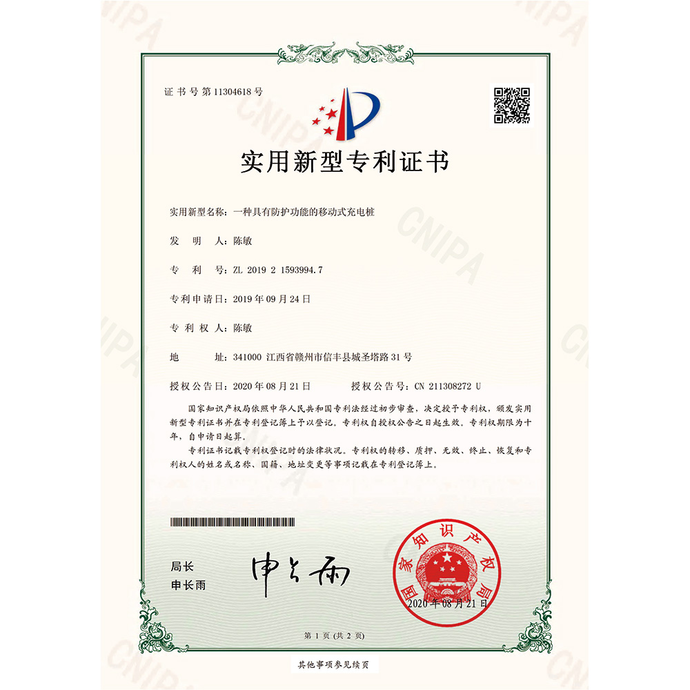 一種具有防護功能的移動式充電樁 實用新型專利證書