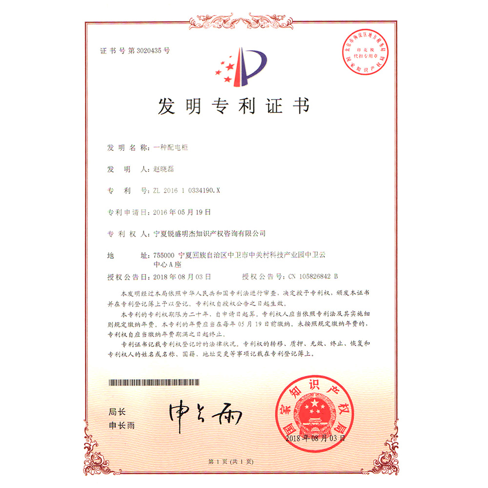 一種配電柜 發明專利證書