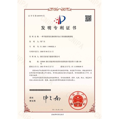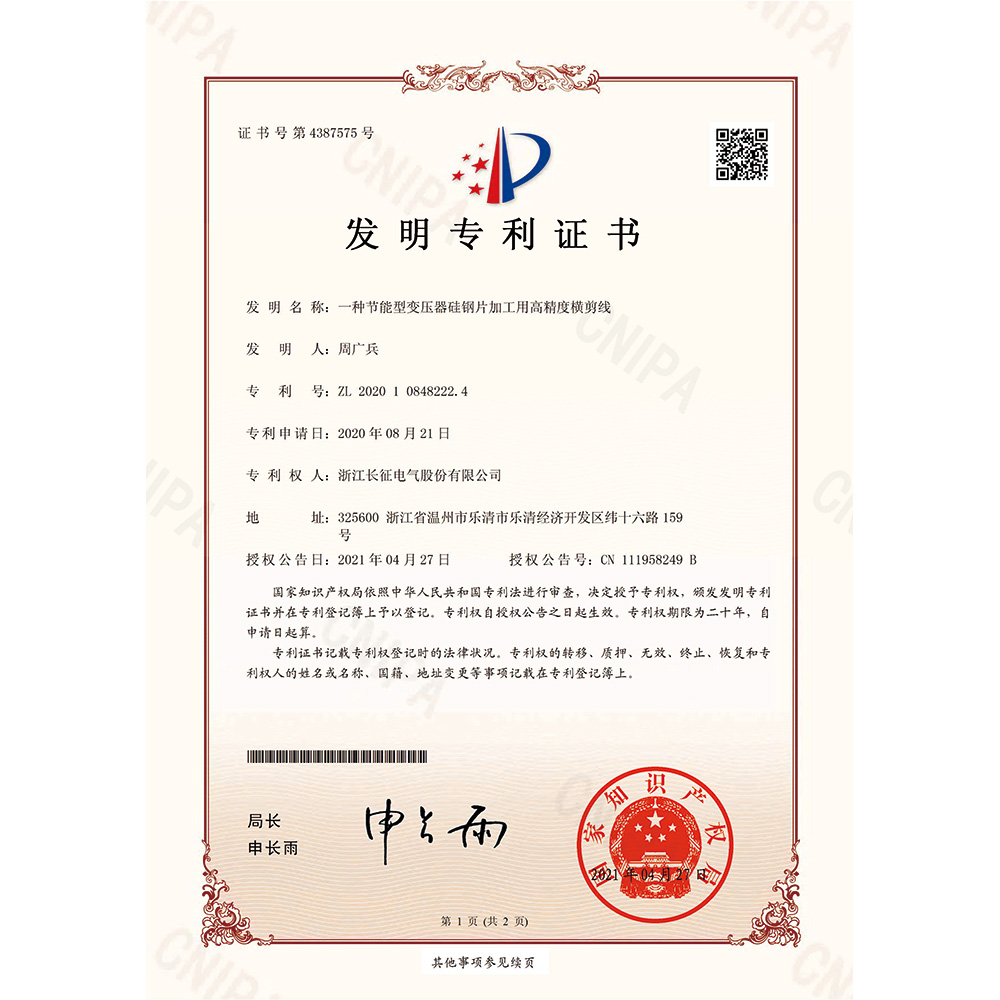 一種節能型變壓器硅鋼片加工用高精度橫剪線 發明專利證書