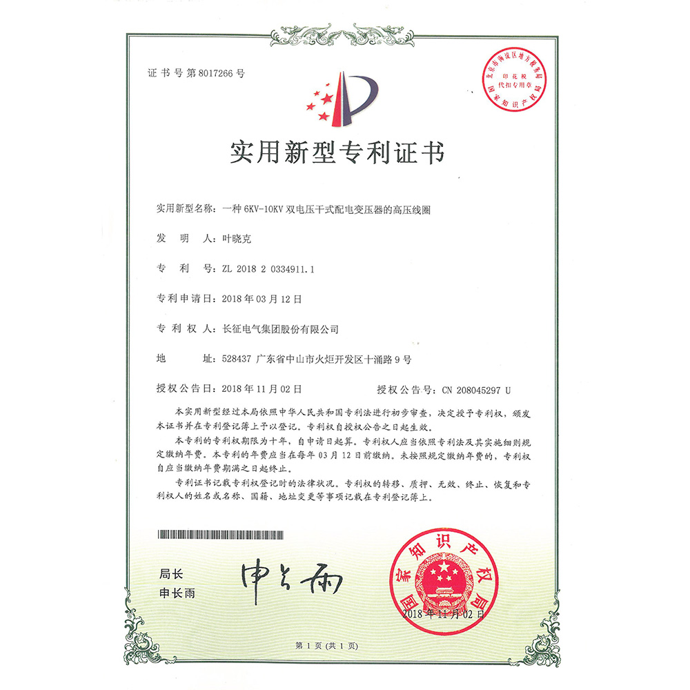 一種6KV-10KV雙電壓干式配電變壓器的高壓線圈 實用新型專利證書