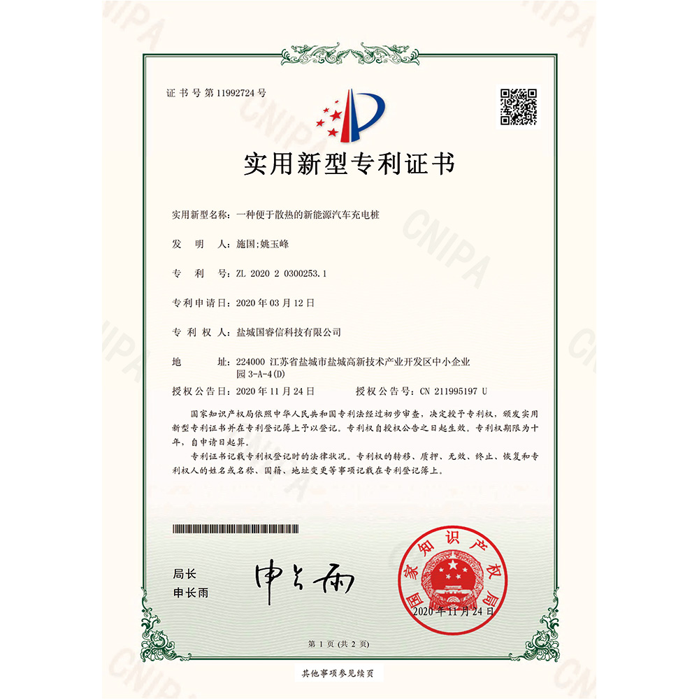 一種便于散熱的新能源汽車充電樁 實用新型專利證書