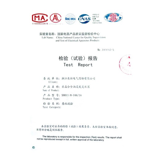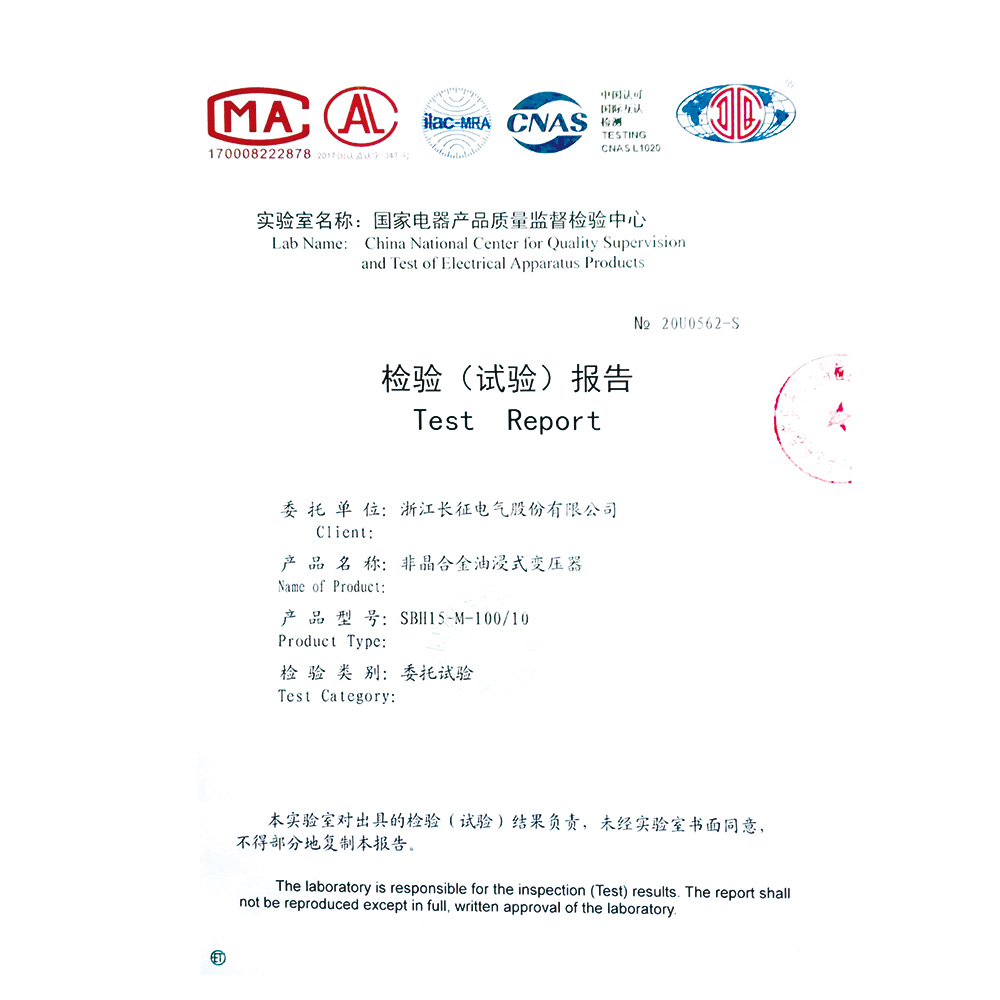 SBH15-M-100/10非晶合金油浸式變壓器 檢驗報告