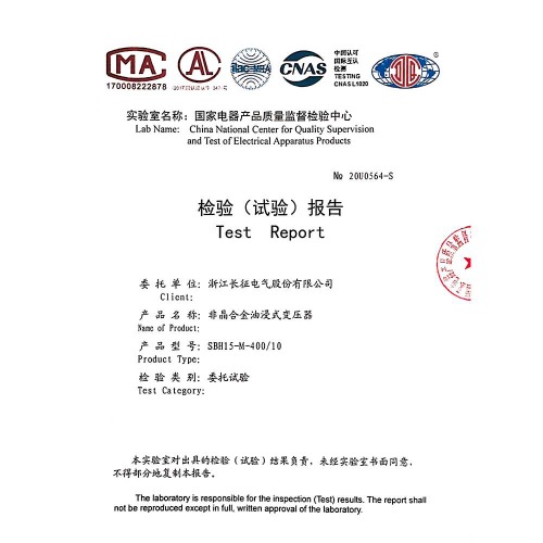 SBH15-M-400/10非晶合金油浸式變壓器 檢驗報告