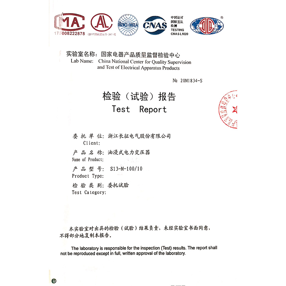 S13-M-100/10油浸式電力變壓器 檢驗報告