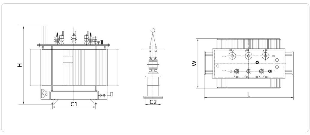 繞組采用瓦楞油道,不浸漆工藝,緊縮帶綁扎。繞組均為同心式線圈,高壓繞組具有對應分接電壓要求的抽頭,引至分接開關上,開關安裝在箱蓋上,且需切斷電源后方可變換分接電壓。